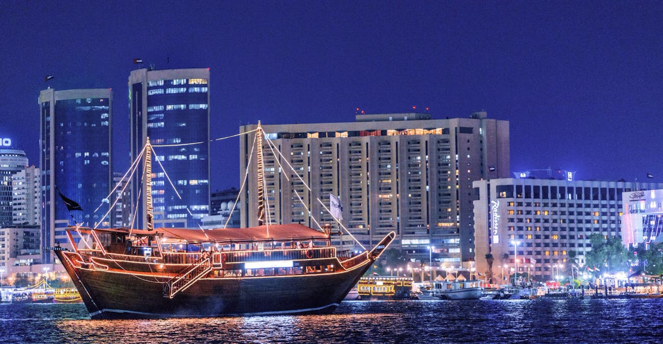 Dubai je tik uz ogromno Arapsko more i nazivaju ga domom potoka i kanala. Mnogi kanali u gradu su savršeni za krstarenje dok gledate kako visoke zgrade i futuristička arhitektura prolaze pored vas. Tradicionalno krstarenje je nezaboravno iskustvo. Videćete kako grad blista jarkim svetlima oko vas dok se prepuštate ukusnoj tradicionalnoj hrani i uživate u zabavnom programu trbušnih plesačica i narodne muzike.